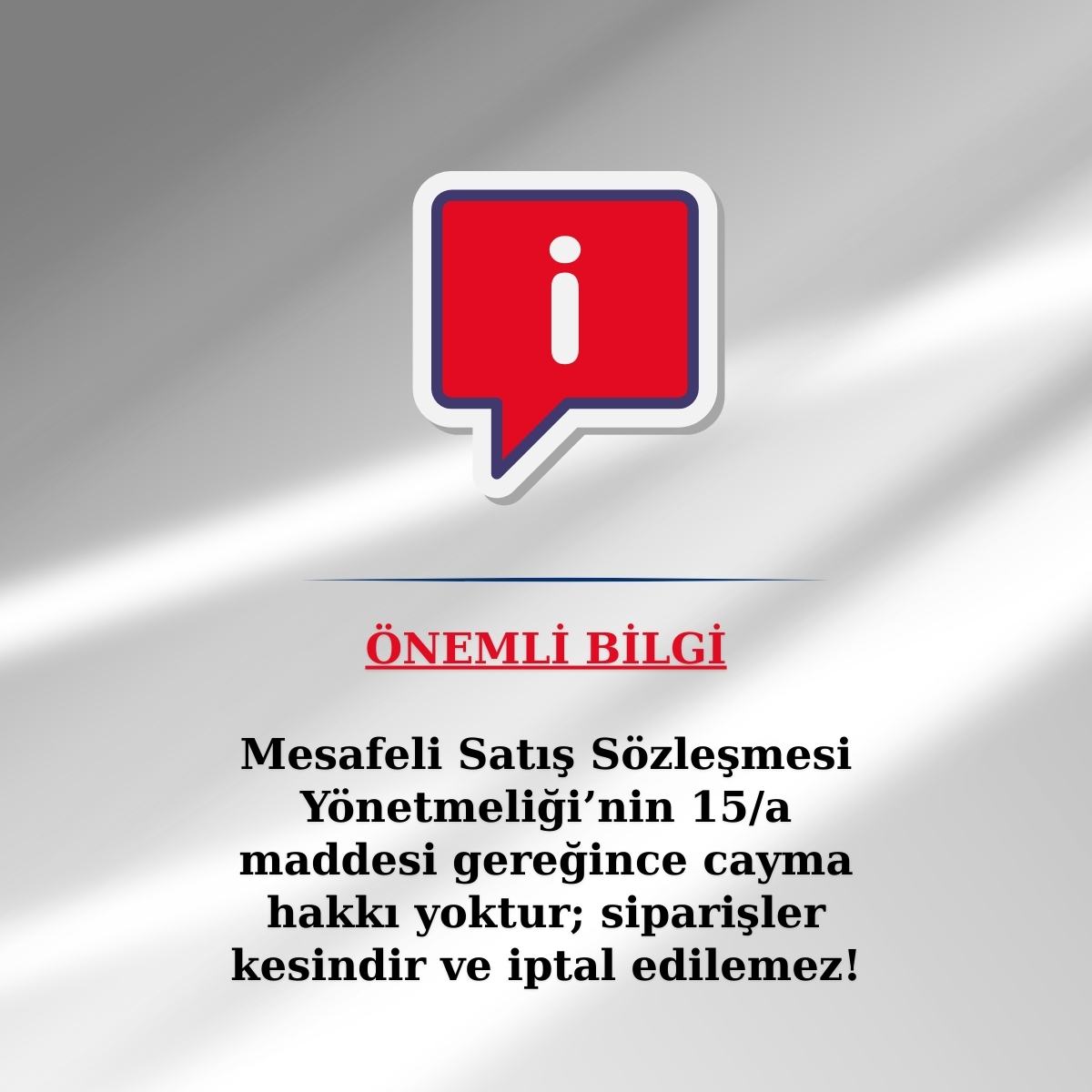 • Mesafeli Satış Sözleşmesi Yönetmeliği’nin 15/a maddesi gereğince cayma hakkı yoktur; siparişler kesindir ve iptal edilemez.